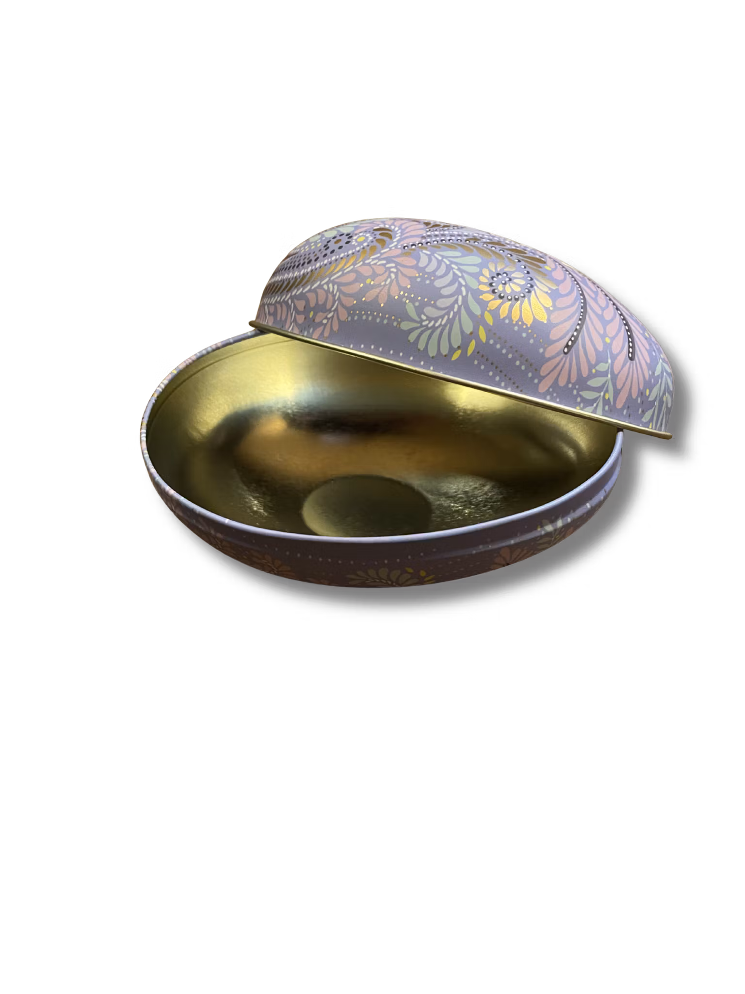 Litet påskägg i plåt med underbart mönster signerat Sarah Miller.