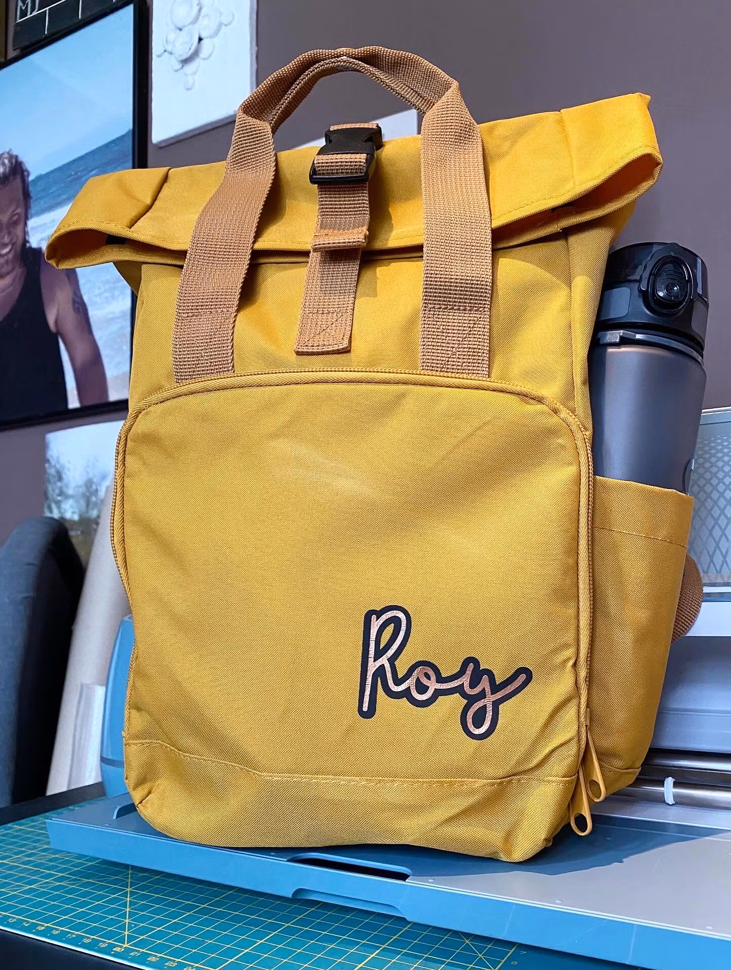 Tryck: Valfritt namn som placeras på framsida (till höger i nederkant av ytterfacket) ELLER baksida (längs med axelbandet på ryggpanelen)