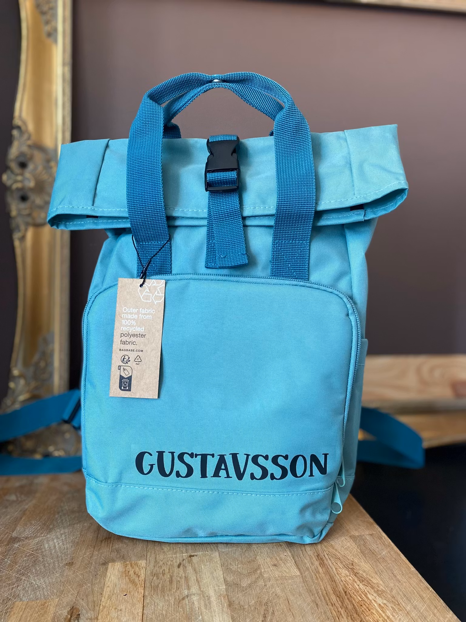 Tryck: Valfritt namn som placeras på framsida (till höger i nederkant av ytterfacket) ELLER baksida (längs med axelbandet på ryggpanelen)